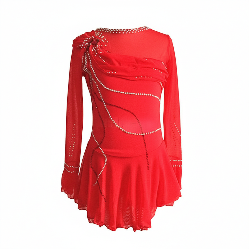 Women's Long Sleeve Mesh Spandex Ice Figure Skating Dress with Crystal Embellishments