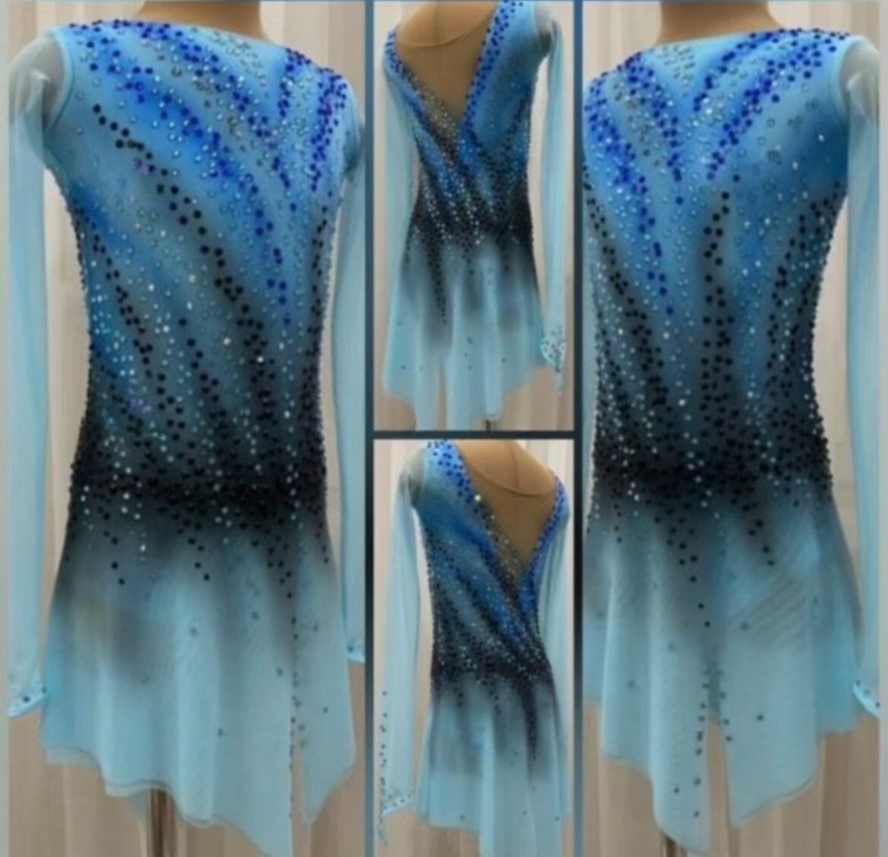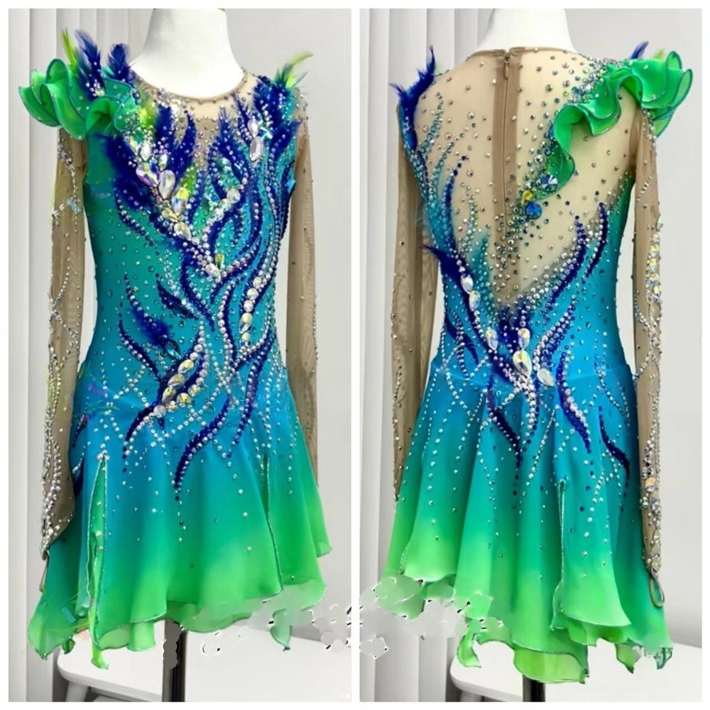 Girls Rhythmic Gymnastics Dress Long Sleeve Mesh Spandex Blue Green Sequined Crystal