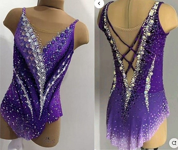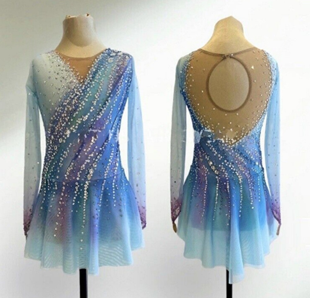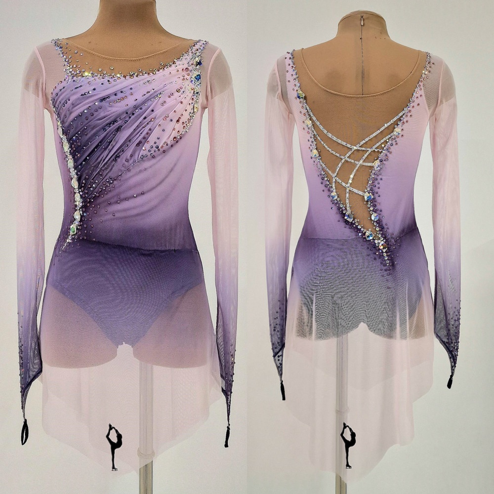 Girls Women Lycra Mesh Long Sleeve Ombre Purple Crystal Backless Figure Skating Dress Rhythmic Gymnastics Leotard