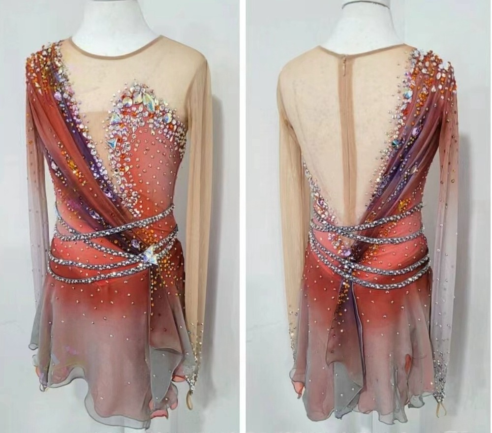 Women's Long Sleeve Spandex Mesh Crystal Orange Rhythmic Gymnastics & Figure Skating Dress