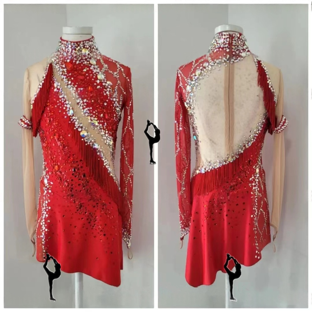 Women's Long Sleeve Ice Figure Skating Dress Spandex Mesh Back Rhinestone Rhythmic Gymnastics Leotard