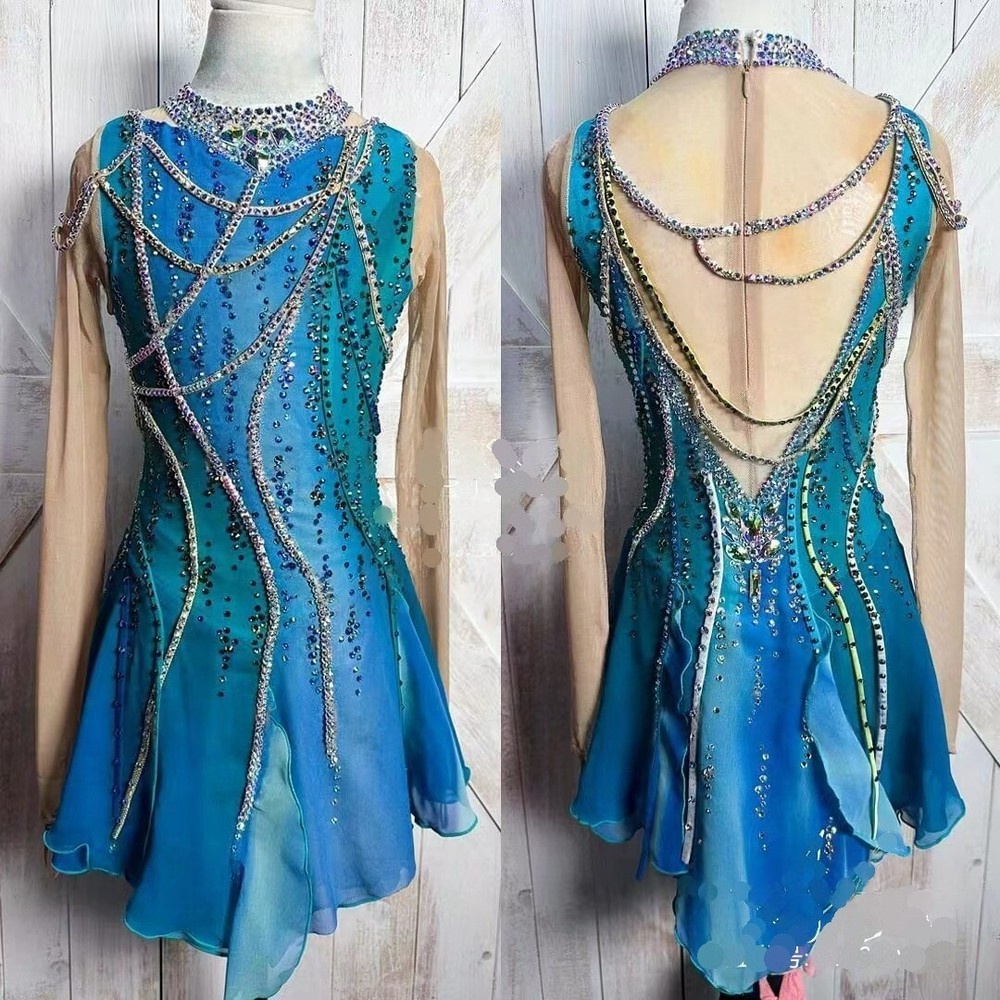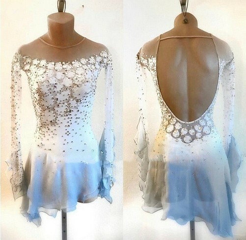 Women's Ice Skating Dress Long Sleeve Blue White Ombre Crystal Mesh Back