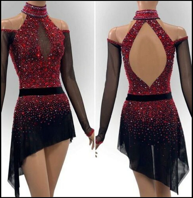 Women's Red Crystal Halter Mesh Long Sleeve Ice Figure Skating Dress