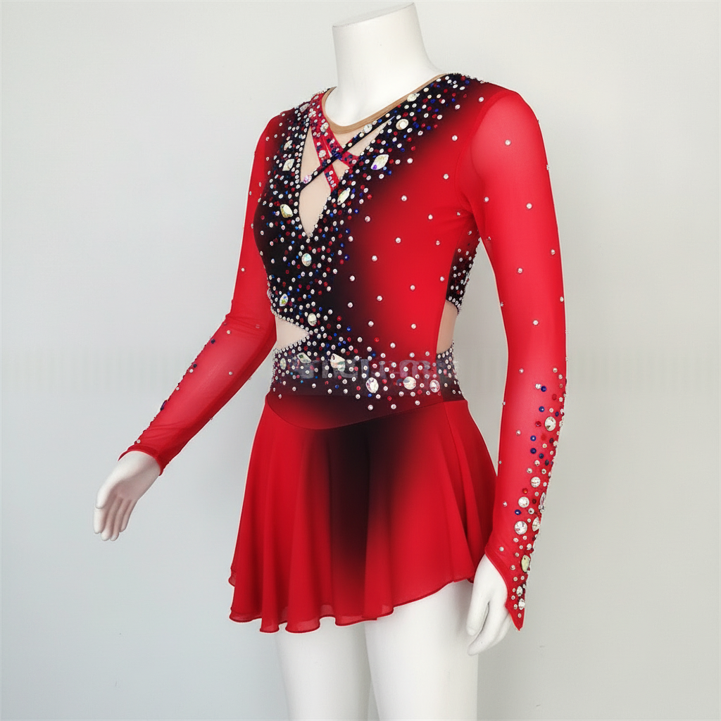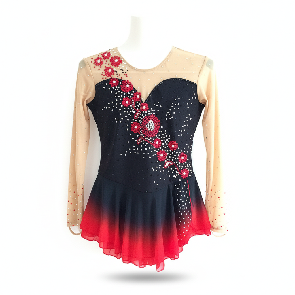 Women's Figure Skating Dress, Long Sleeve, Black/Red Ombre, Rhinestone Embellished