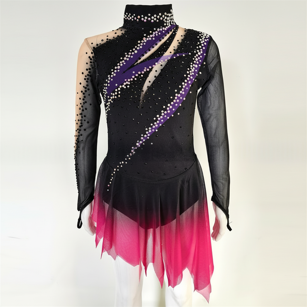 Women's Ice Skating Dress, Mesh, Black/Purple/Pink, Long Sleeve