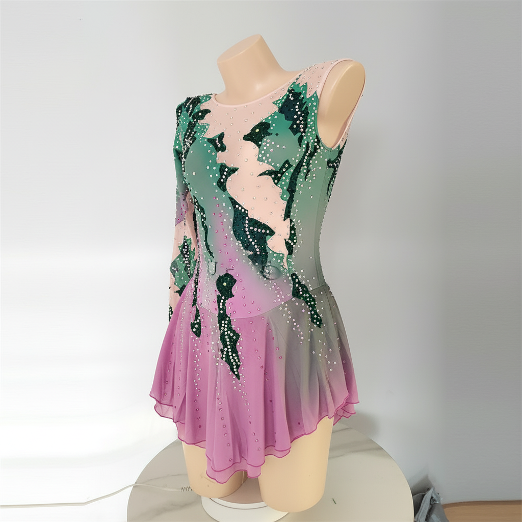 Women's Figure Skating Dress, Ombre Mesh, Long Sleeve, Pink/Green, Adult Medium