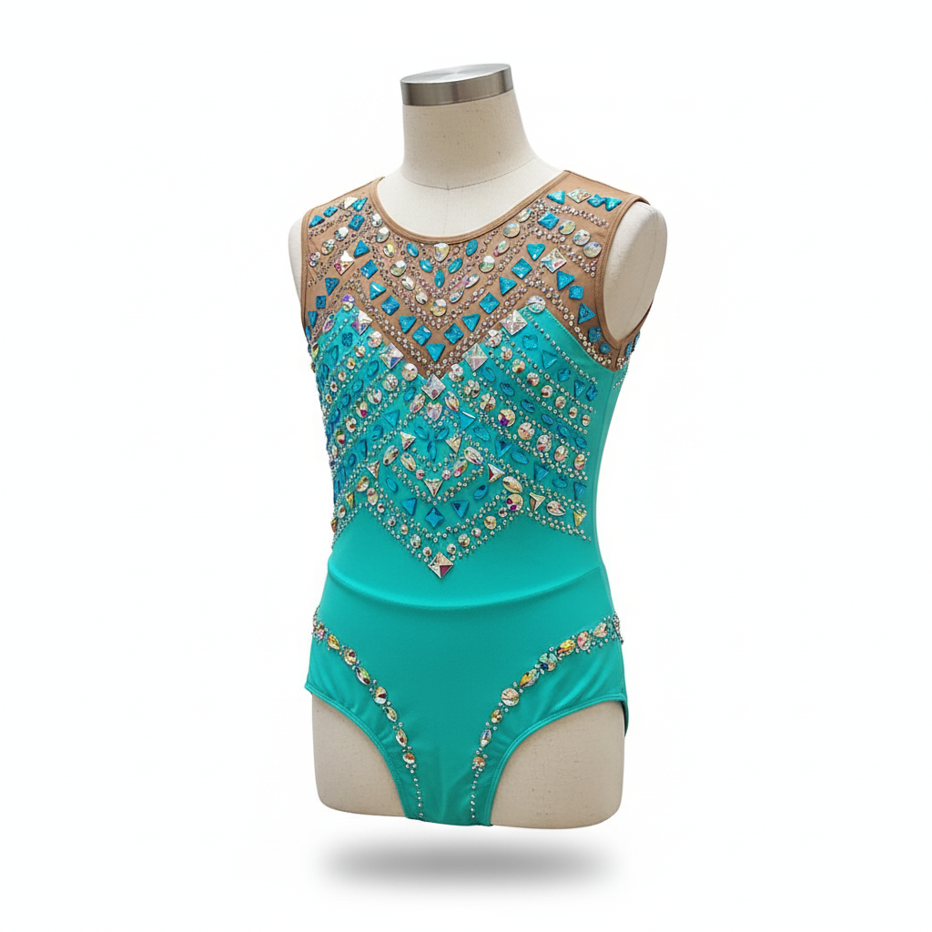 Women's Leotard, Rhinestone Embellished, Aqua Blue, Sleeveless