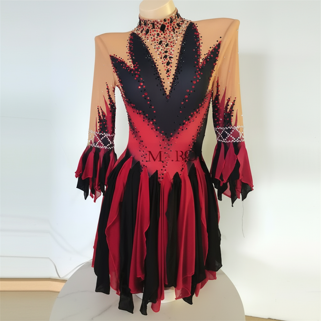 Women's Rhythmic Gymnastics Leotard, Spandex Mesh, Red/Black, Long Sleeve