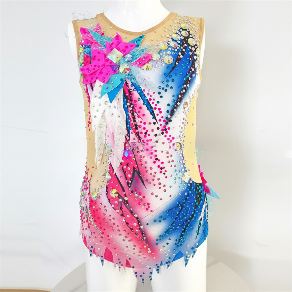 Girls Rhythmic Gymnastics Leotard, Sleeveless, Pink/Blue/White, Child/Adult Sizes