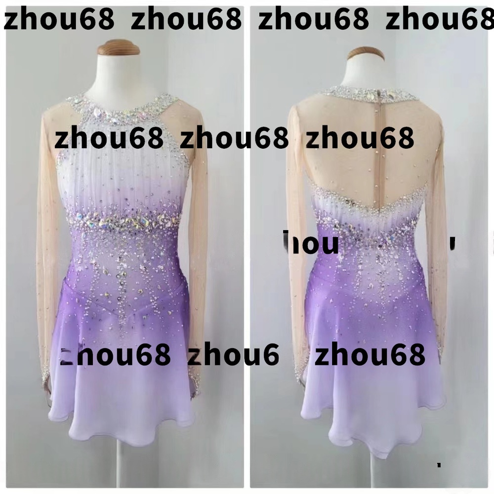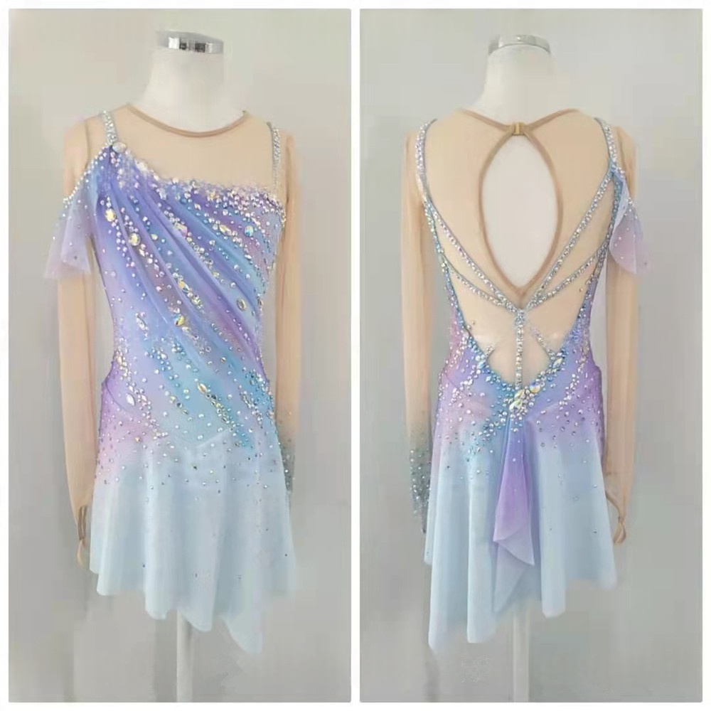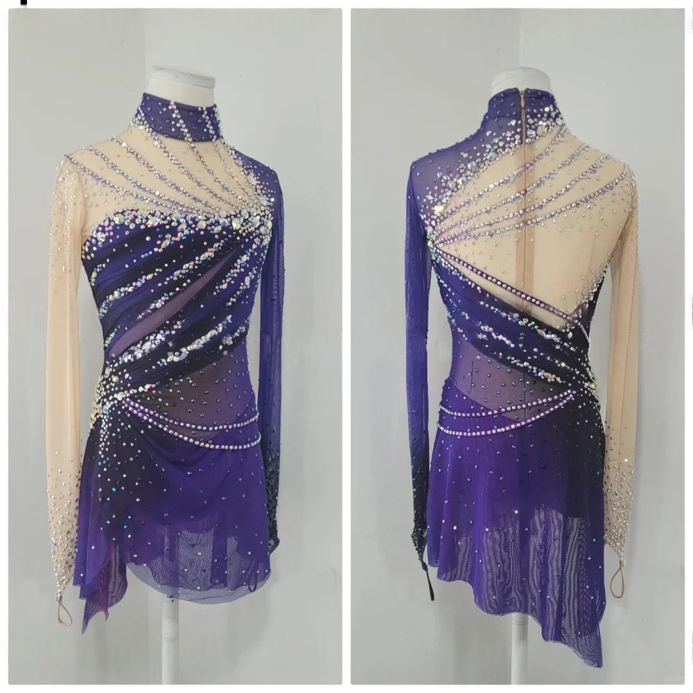 Girls Women Long Sleeve Figure Skating Dress Rhythmic Gymnastics Leotard Spandex Mesh Crystal Ombre Purple