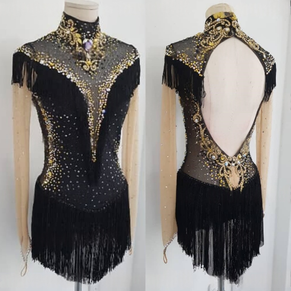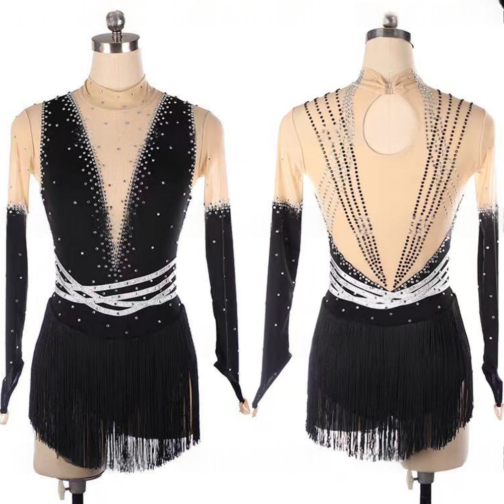 Women's Black Spandex Mesh Long Sleeve Rhinestone Fringe Rhythmic Gymnastics Leotard