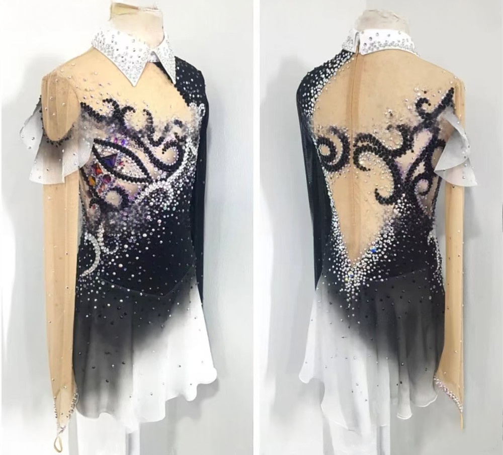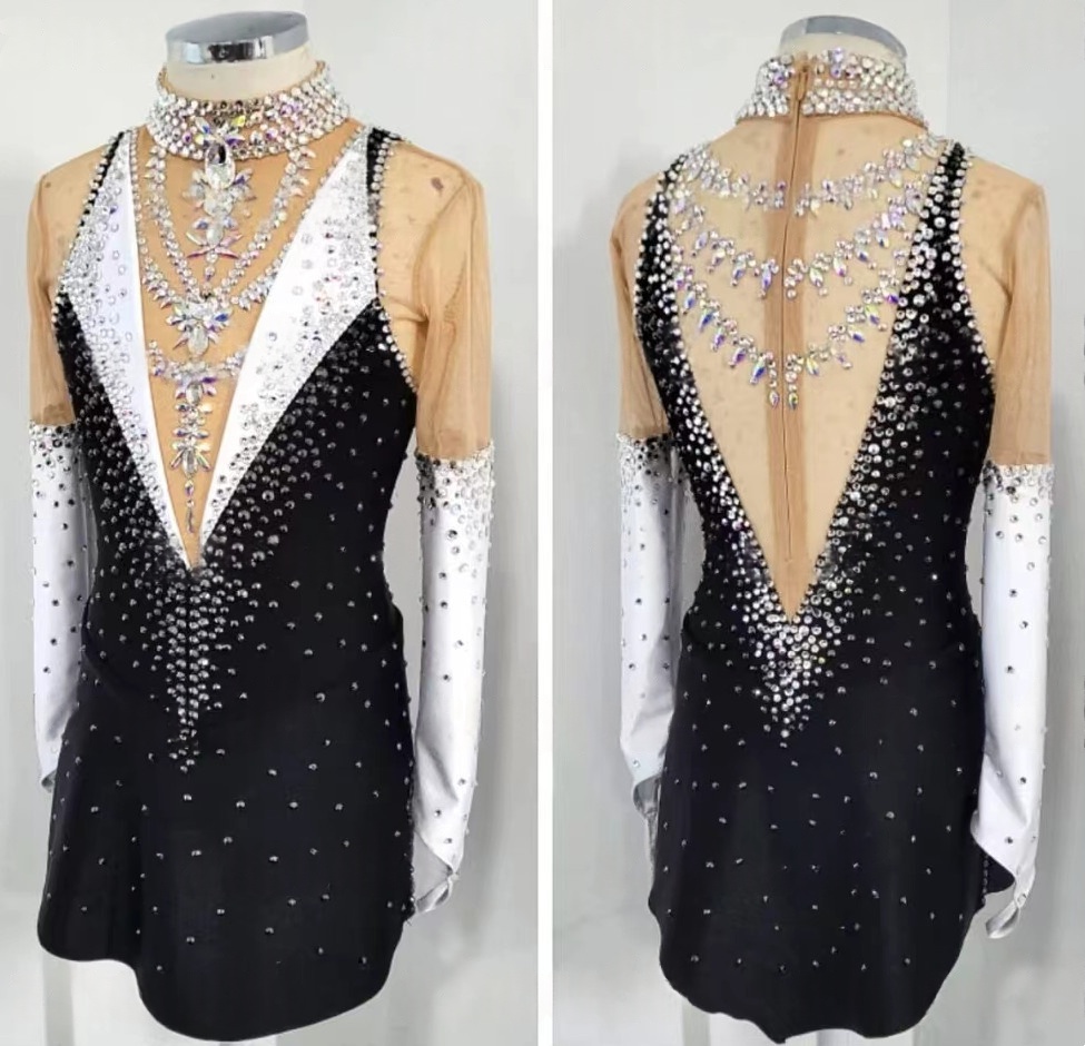 Girls Rhythmic Gymnastics Leotard Spandex Mesh Long Sleeve Crystal Sequined Black White Gradient Dress