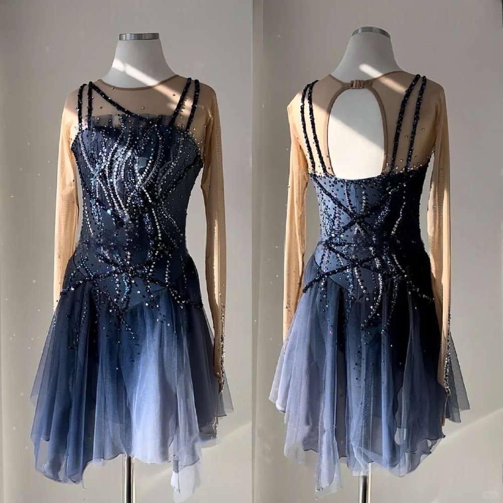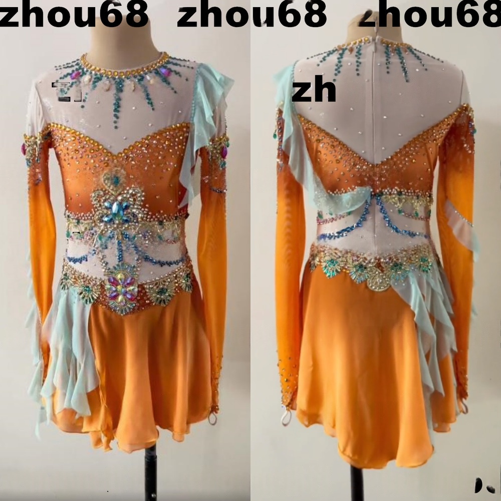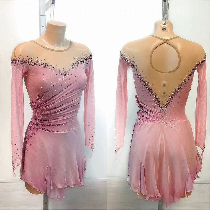Girls Women Long Sleeve Figure Skating Dress Spandex Mesh Crystal Sequined Rhythmic Gymnastics Leotard