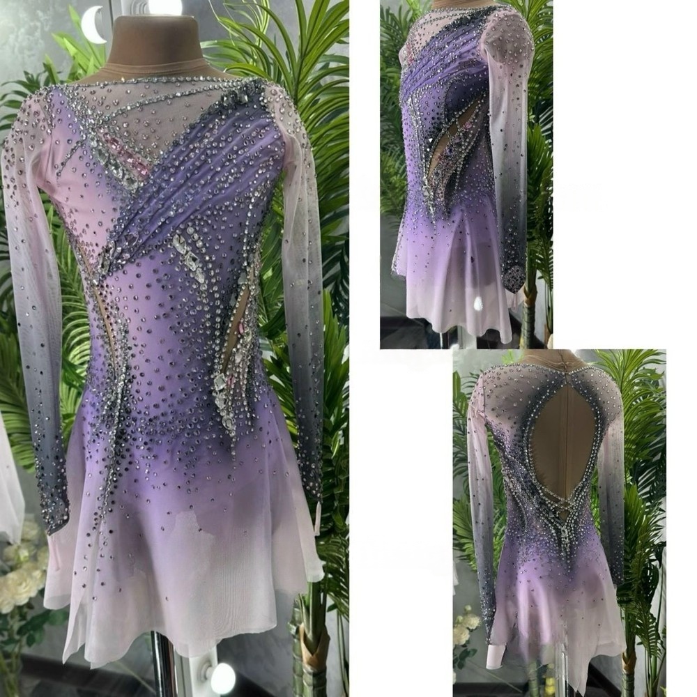 Women's Long Sleeve Mesh Ice Figure Skating Dress Spandex Rhythmic Gymnastics Leotard