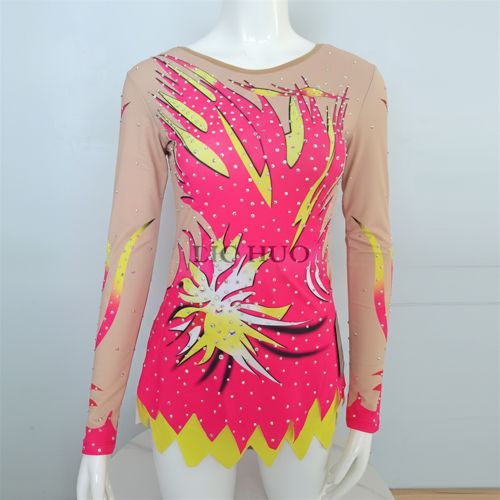 Girls Rhythmic Gymnastics Leotard, Spandex, Pink/Yellow/White, Long Sleeve