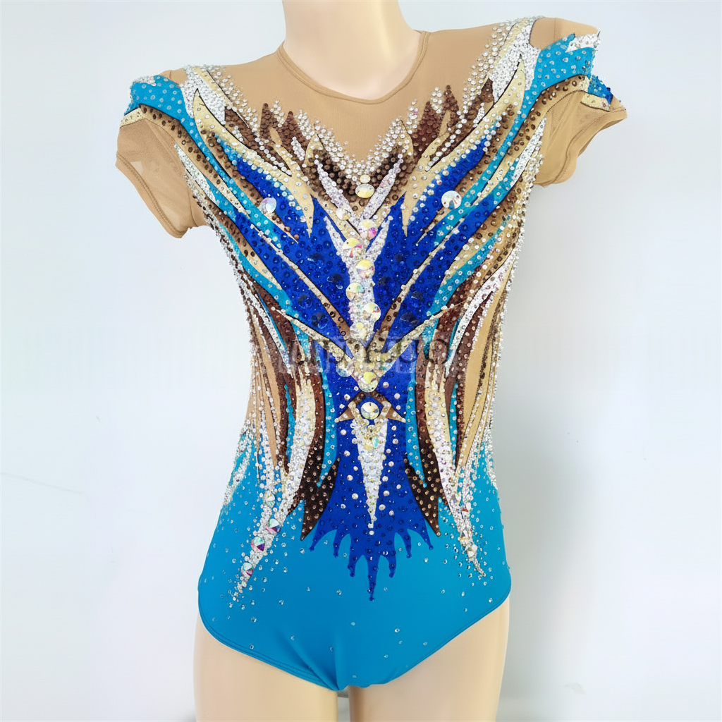 Women's Rhythmic Gymnastics Leotard, Spandex, Blue/Brown/White, Short Sleeve