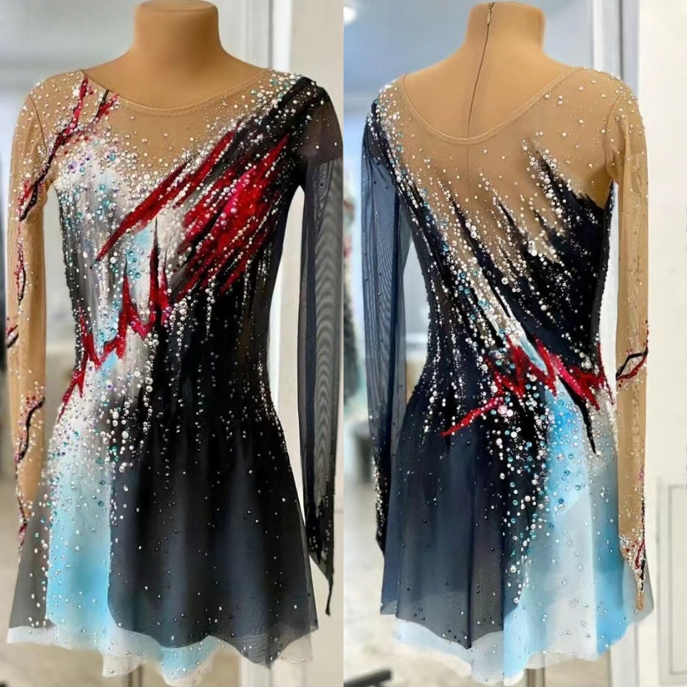 Women's Long Sleeve Mesh Spandex Ice Figure Skating Dress with Crystal Embellishments