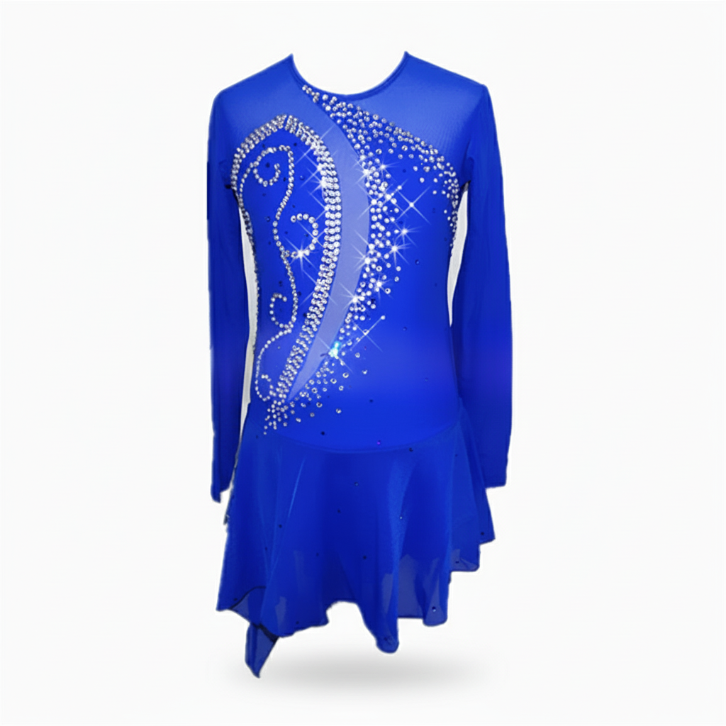 Girls Figure Skating Dress Spandex Mesh Long Sleeve Blue with Rhinestones