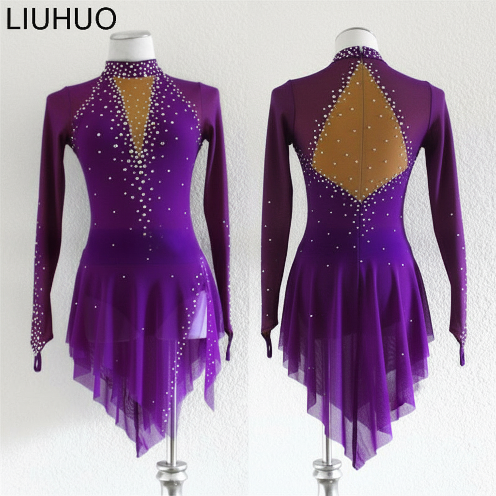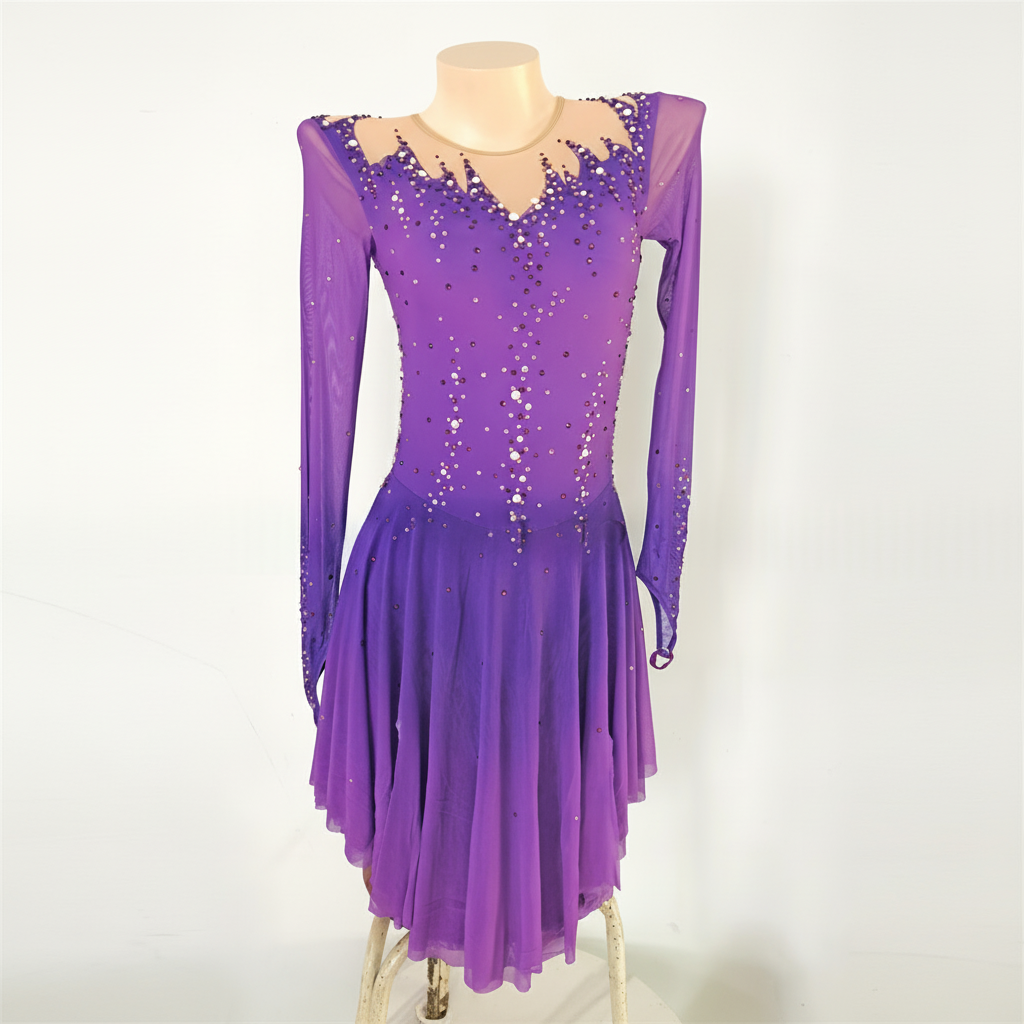 Women's Figure Skating Dress, Mesh & Rhinestone, Purple, Long Sleeve