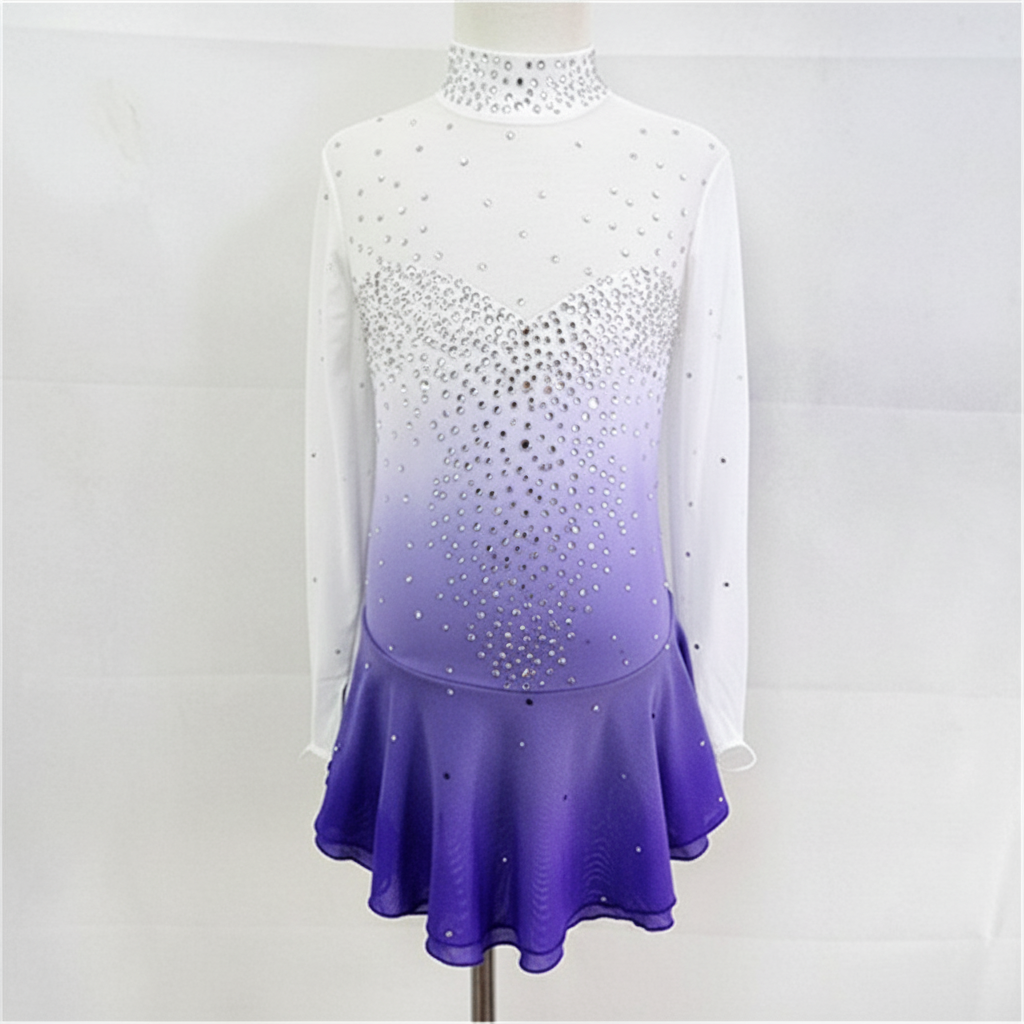 Girls' Figure Skating Dress, Ombre Purple & White, Long Sleeve, Rhinestone Accents