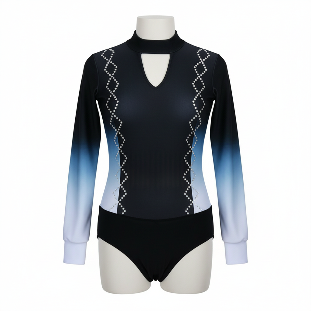 Women's Figure Skating Dress, Ombre Blue/Black/White, Long Sleeve, Rhinestone Accents
