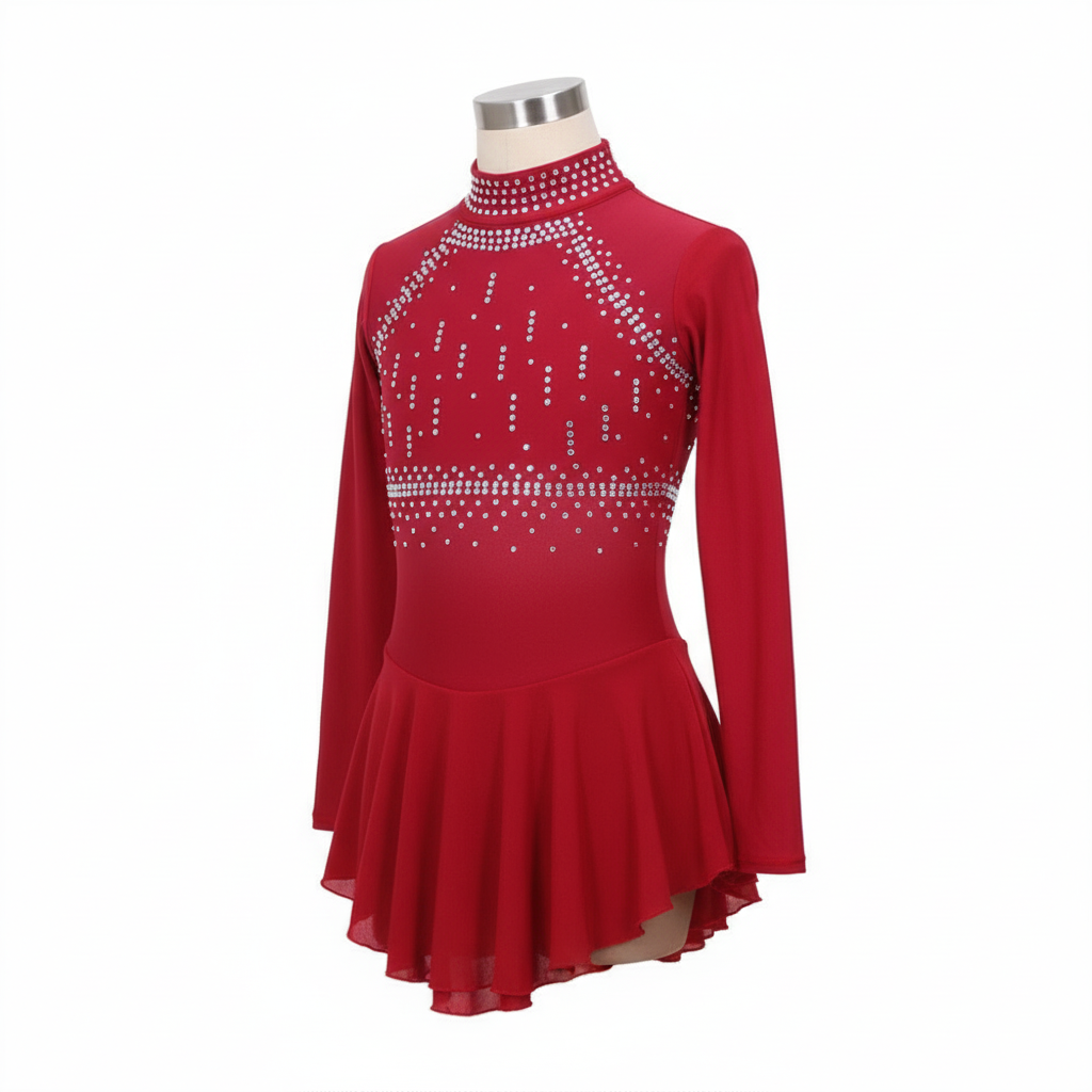 Girls Figure Skating Dress Long Sleeve, Rhinestone, Red, Child Size