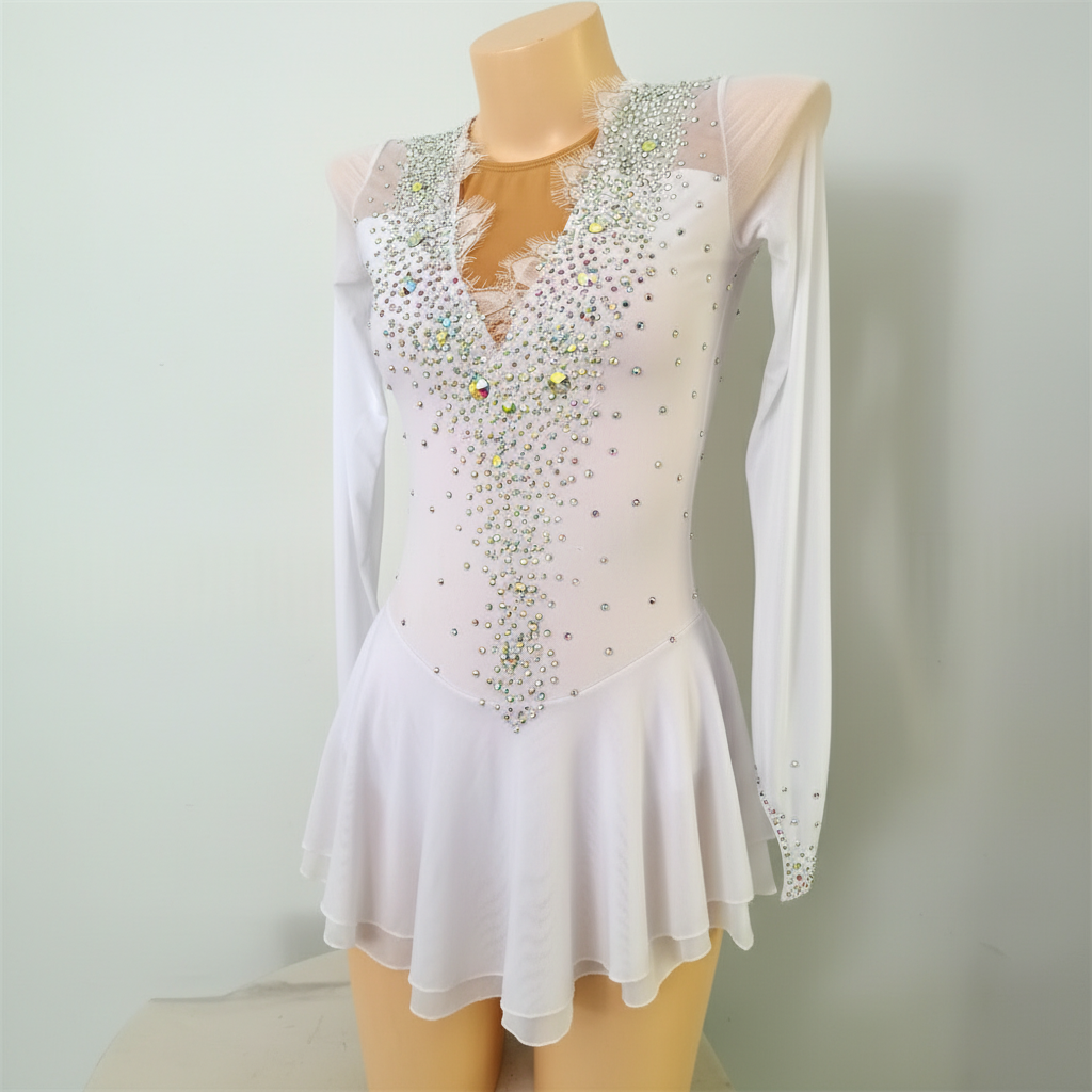 Women's Figure Skating Dress, Long Sleeve, White, Rhinestone Embellished