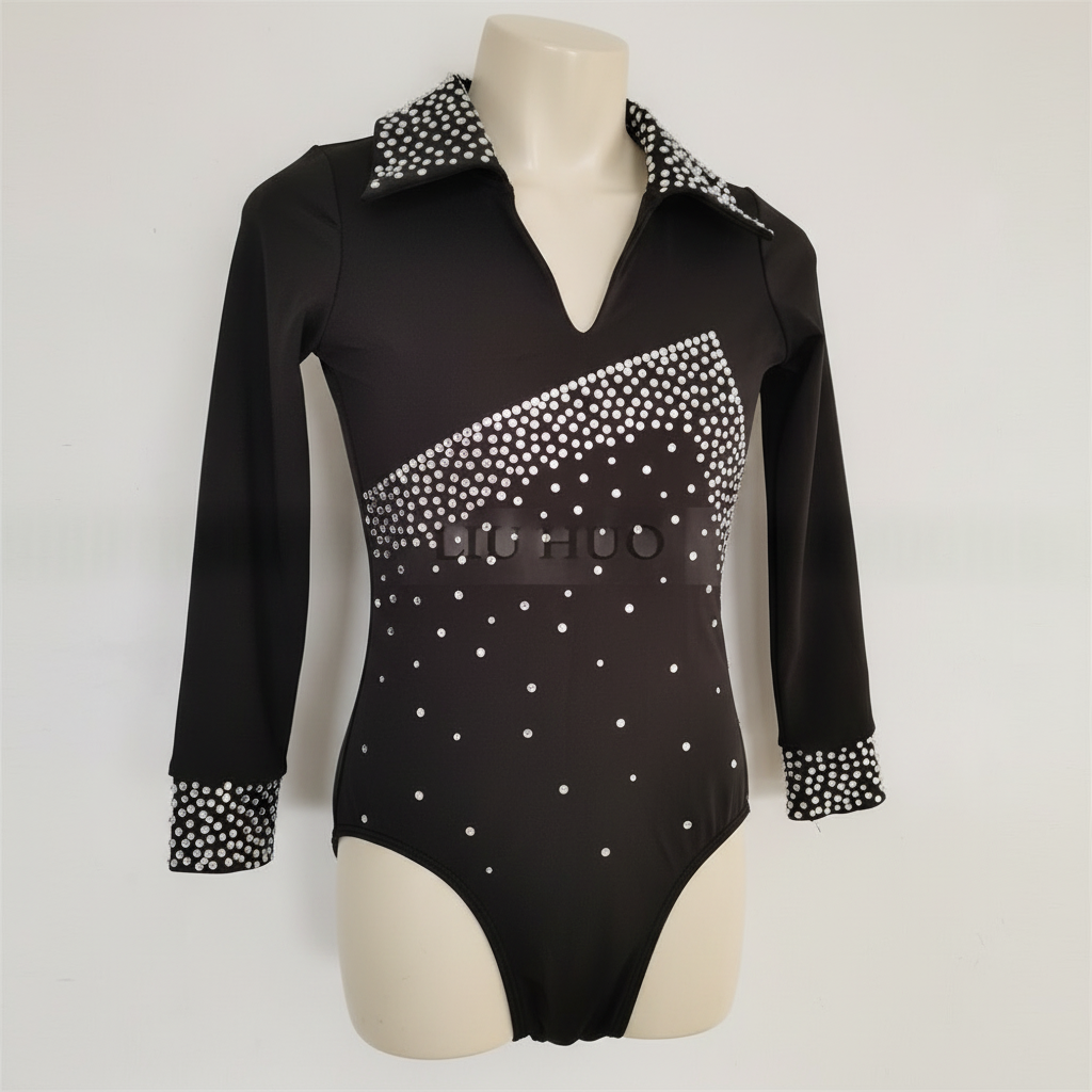 Women's Latin Dance Leotard, Rhinestone Embellished, Black, Long Sleeve