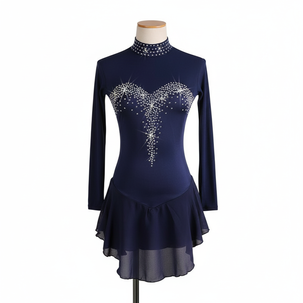 Women's Ballroom Dance Dress, Rhinestone Embellished, Long Sleeve, Navy Blue