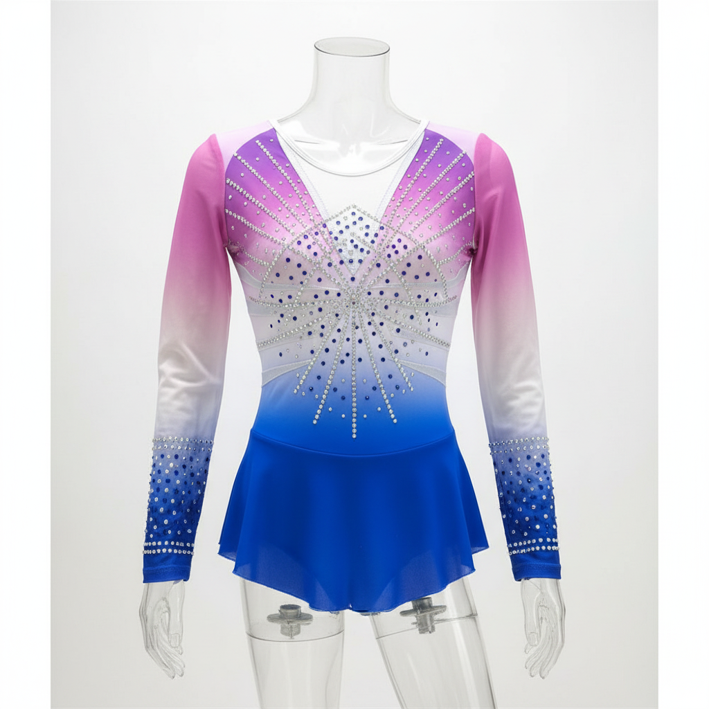 Women's Ombre Gymnastics Leotard, Rhinestone Embellished, Long Sleeve, Pink/Purple/Blue