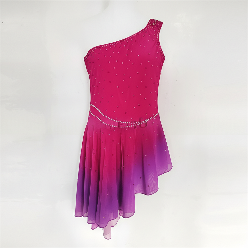 Women's Ice Skating Dress, Ombre Pink Purple, Asymmetrical Rhinestone