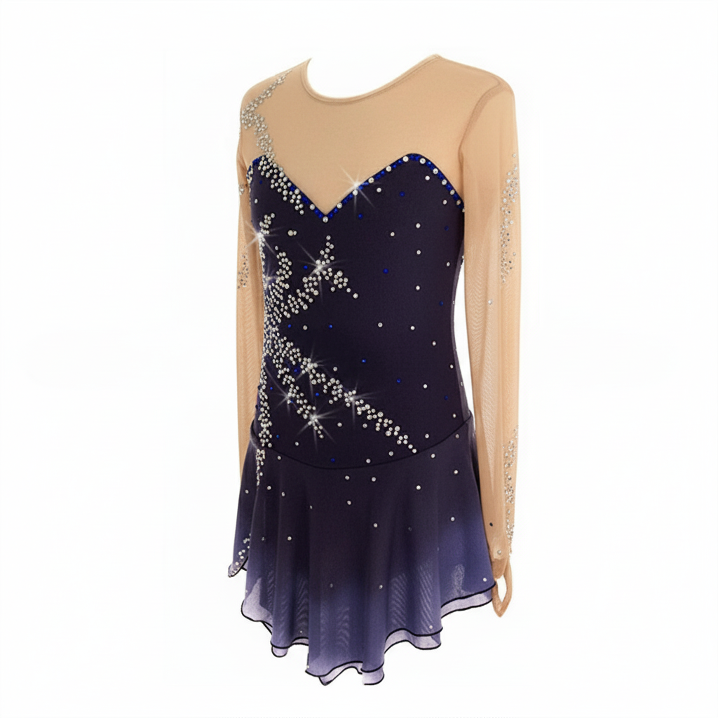 Women's Figure Skating Dress, Long Sleeve, Rhinestone Embellished, Ombre Blue/Purple, Performance Leotard