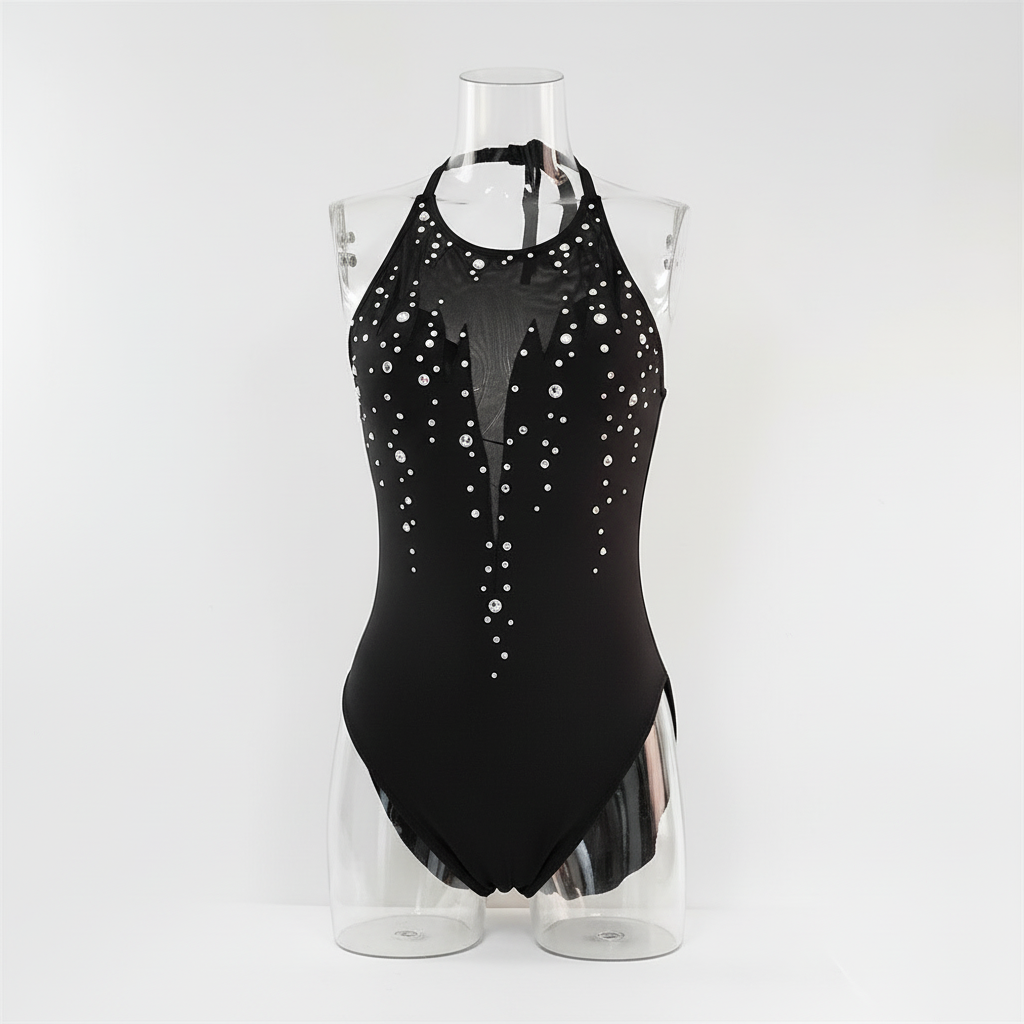 Women's Halter Neck Bodysuit with Rhinestones, Black, S-XXL