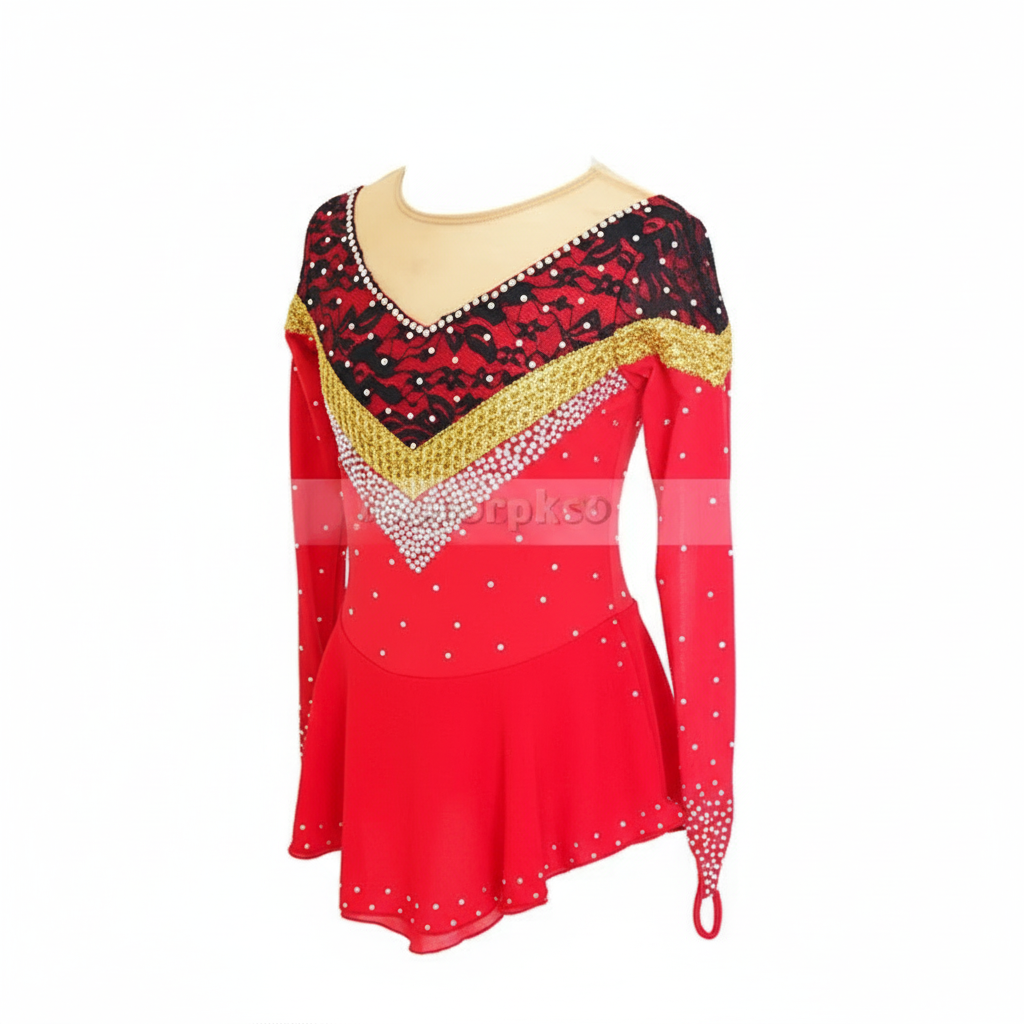 Women's Ice Skating Dress, Sequined Lace, Red/Black, Long Sleeve