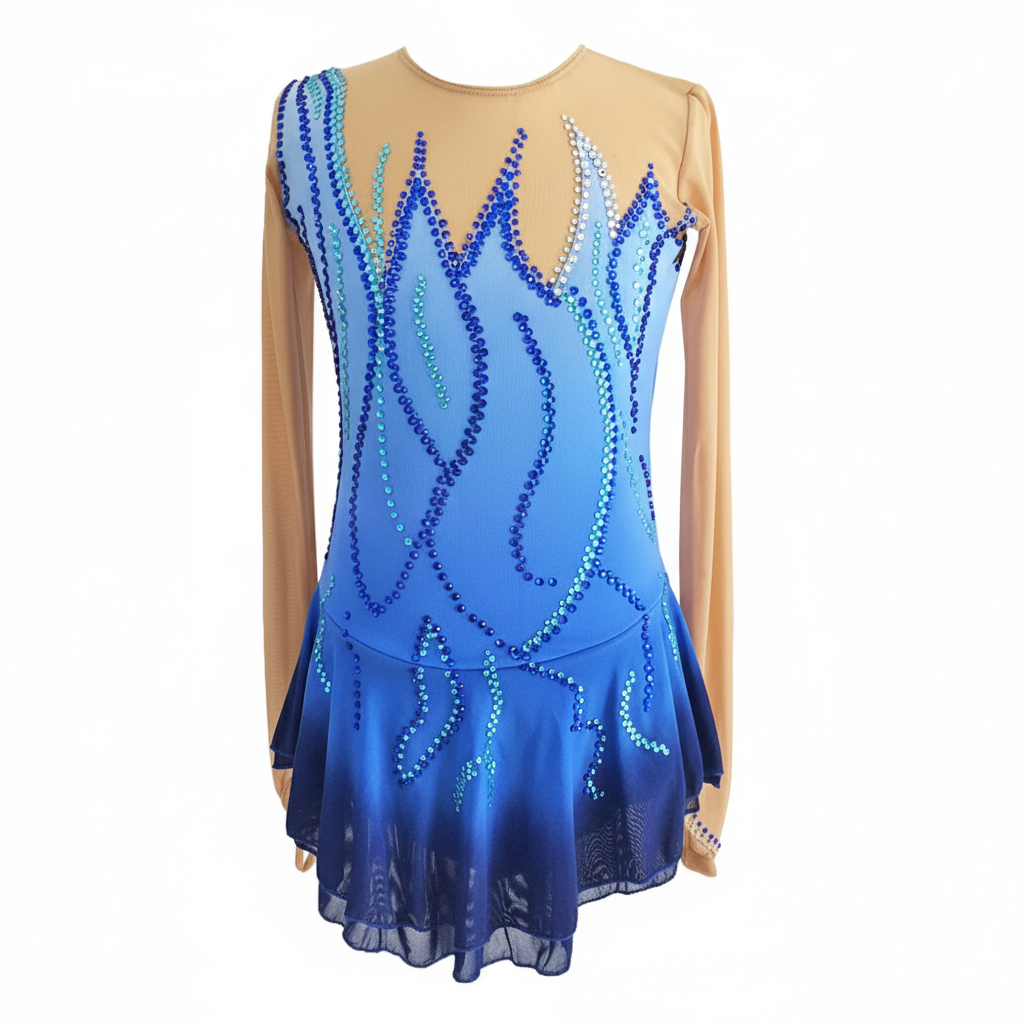 Women's Figure Skating Dress Ombre Blue Rhinestone Long Sleeve