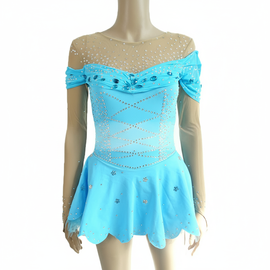 Girls Ice Skating Dress, Rhinestone Embellished, Off-Shoulder, Light Blue, Long Sleeve