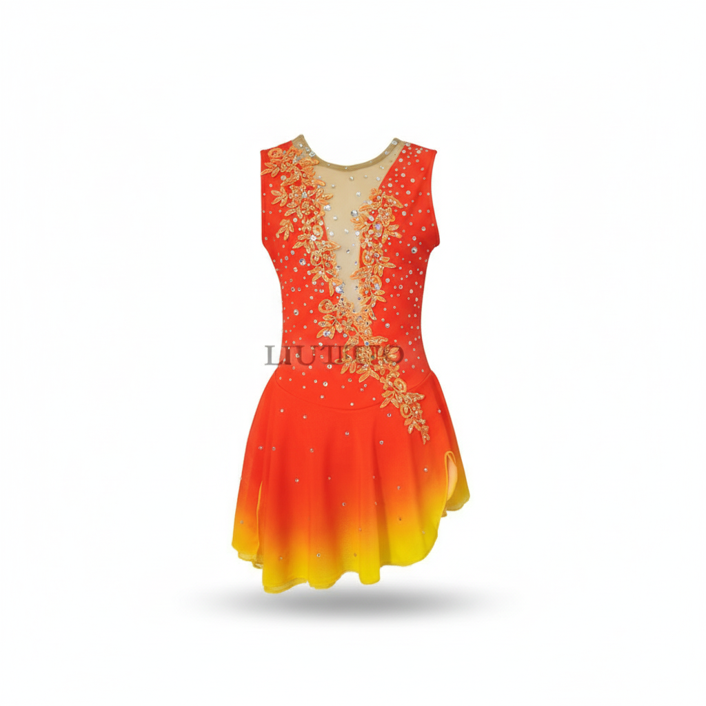 Girls' Ice Skating Dress, Ombre Orange Yellow, Rhinestone Applique, Sleeveless