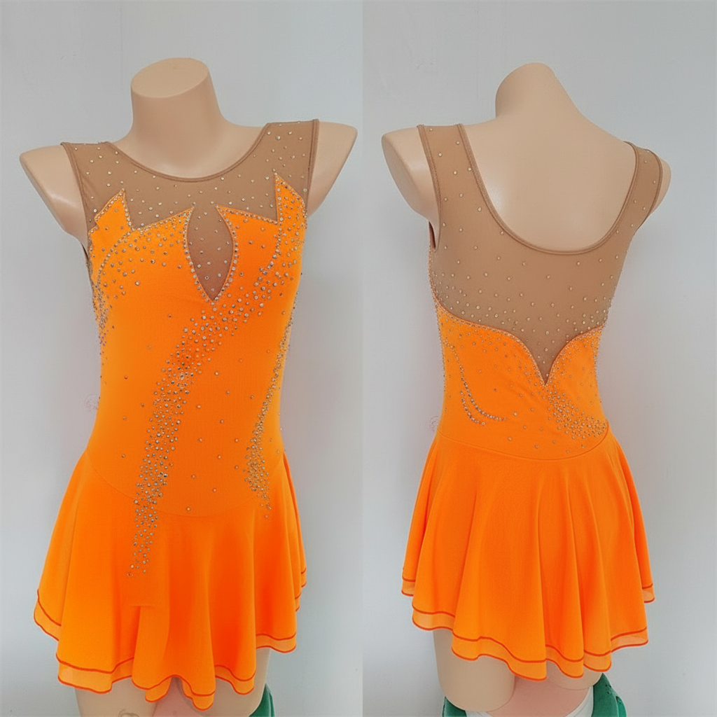 Girls Figure Skating Dress, Sleeveless, Orange, Rhinestone Embellished