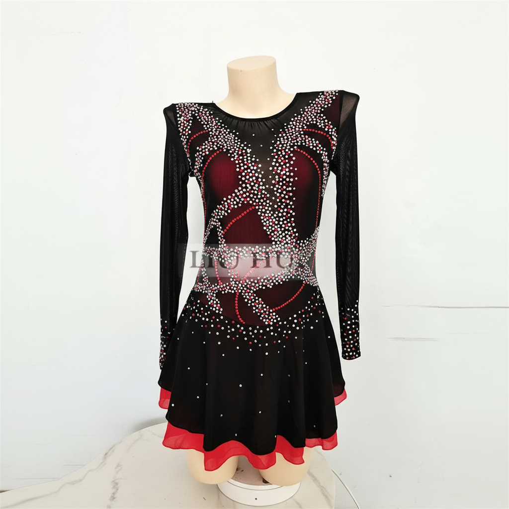 Women's Figure Skating Dress, Mesh, Rhinestone Embellished, Black/Red, Long Sleeve