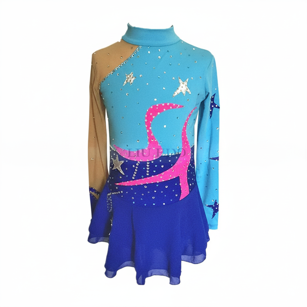 Girls Ice Skating Dress Sequined Long Sleeve Blue/Pink/Nude Spandex 5-16 Years