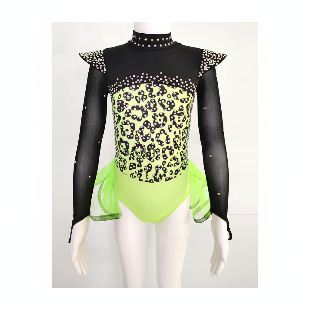 Girls Dance Leotard, Mesh Long Sleeve, Neon Green/Black, Rhinestone Leopard Print