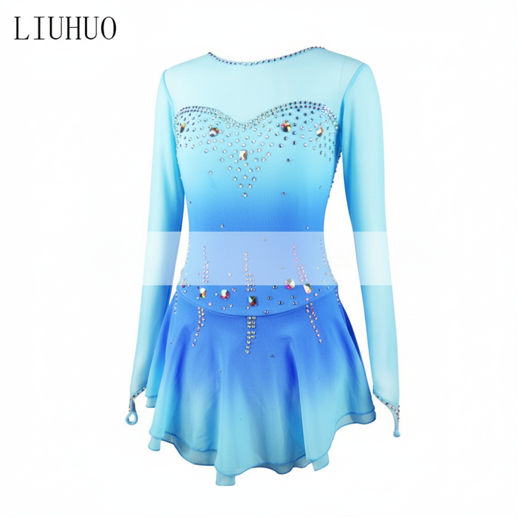 Women's Figure Skating Dress, Ombre Blue, Rhinestone Embellished, Long Sleeve