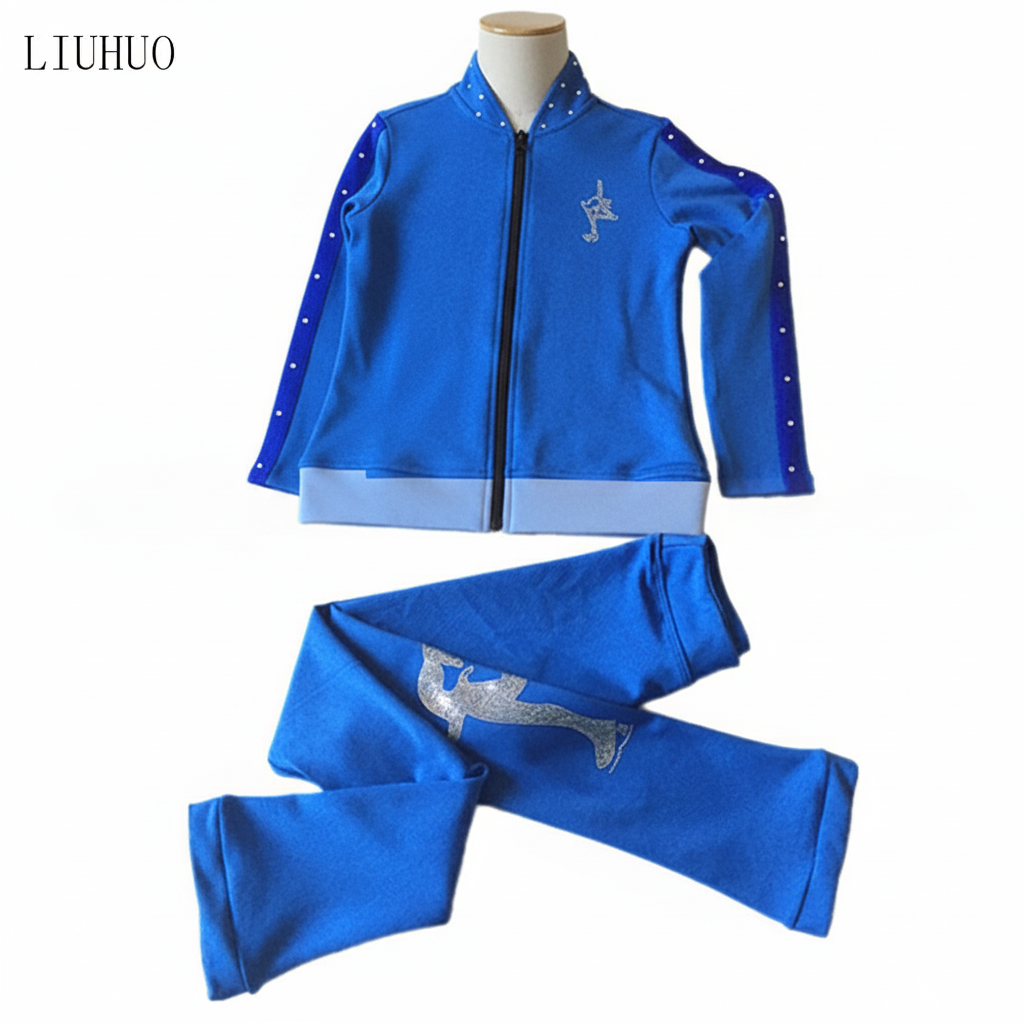 Girls Figure Skating Training Suit Stretchable Royal Blue with Rhinestones