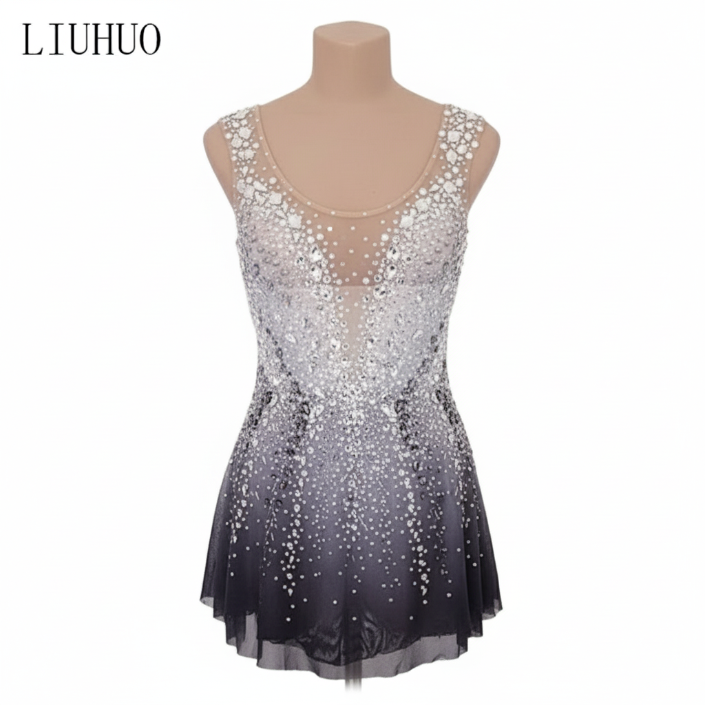 Women's Ice Skating Dress, Sequined Ombre, Sleeveless, Black and White, Adult