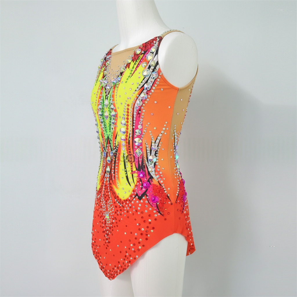 Women's Rhythmic Gymnastics Leotard, Sleeveless, Colorful Rhinestone Embellished, Orange/Yellow