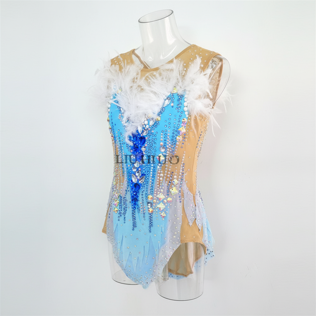 Girls Rhythmic Gymnastics Leotard, Feather Rhinestone, Blue, Custom Size