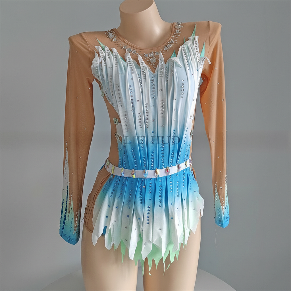 Women's Rhythmic Gymnastics Leotard, Ombre Blue Green, Long Sleeve, Rhinestone Embellished
