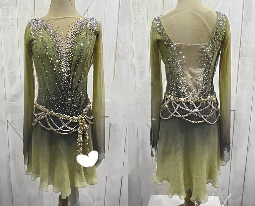 Women's Rhythmic Gymnastics Leotard, Velvet & Mesh, Green & Nude, Embellished