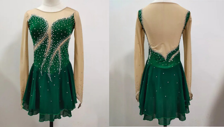 Women's Long Sleeve Velvet Mesh Crystal Embellished Open Back Figure Skating Dress