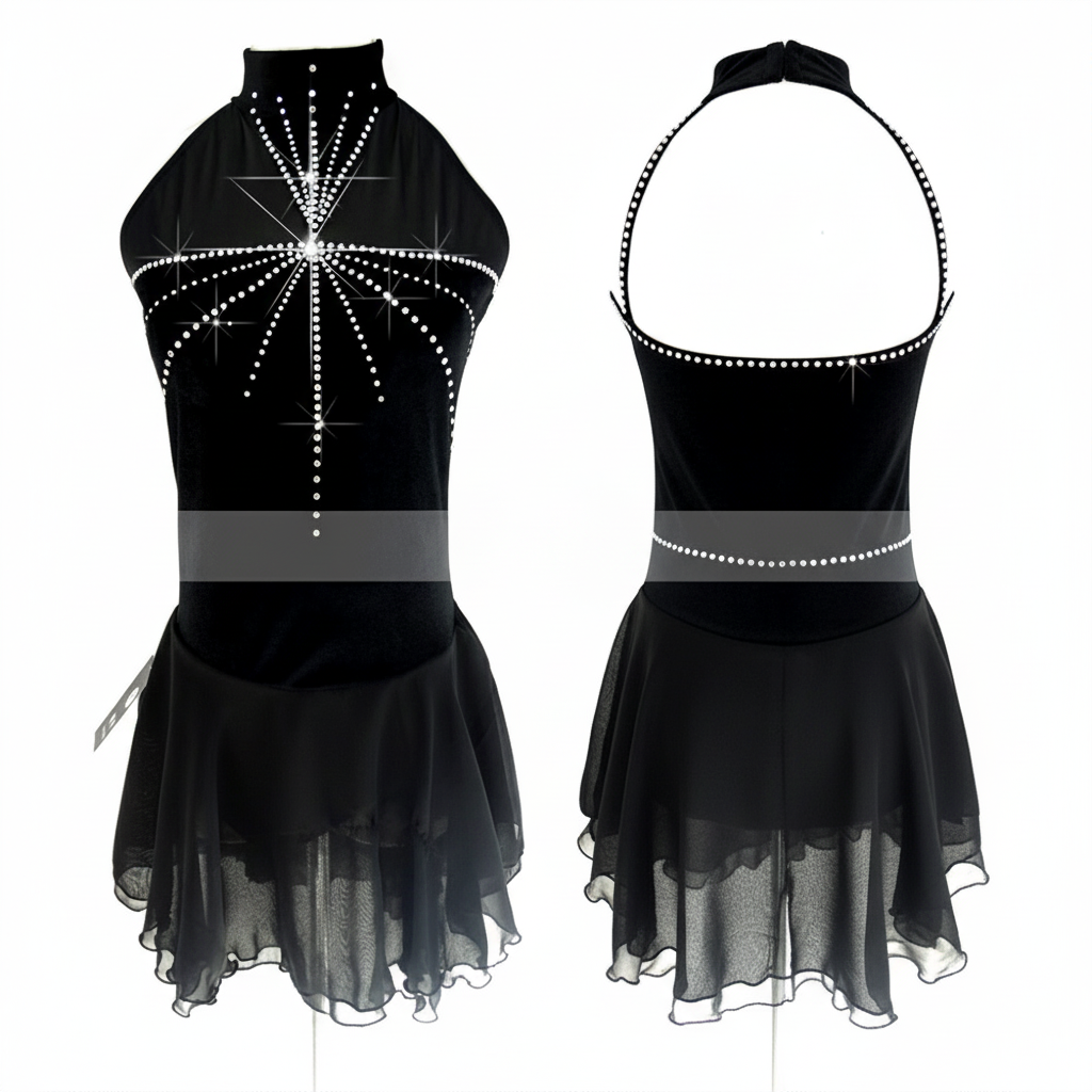 Women's Halter Neck Figure Skating Dress, Velvet & Mesh, Black, All Sizes